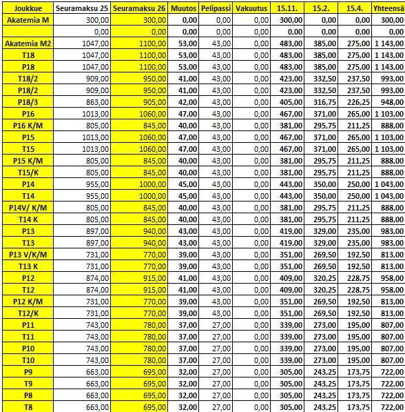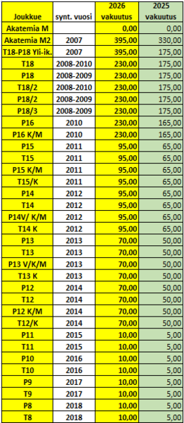 PELAAJAN SEURA-, PELIPASSI- JA VAKUUTUSMAKSUT 2026
